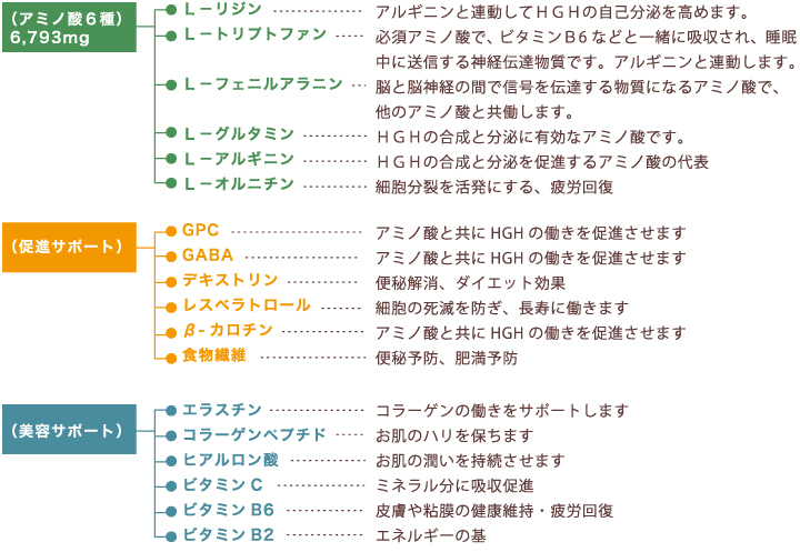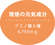 | 国産中心のアミノ酸6種を厳選して配合しました。 ヒトの身体の各臓器、筋肉、皮膚のコラーゲン、免疫細胞、酸素などを 構成する重要成分の「アミノ酸」を6.793mg配合しました。 |